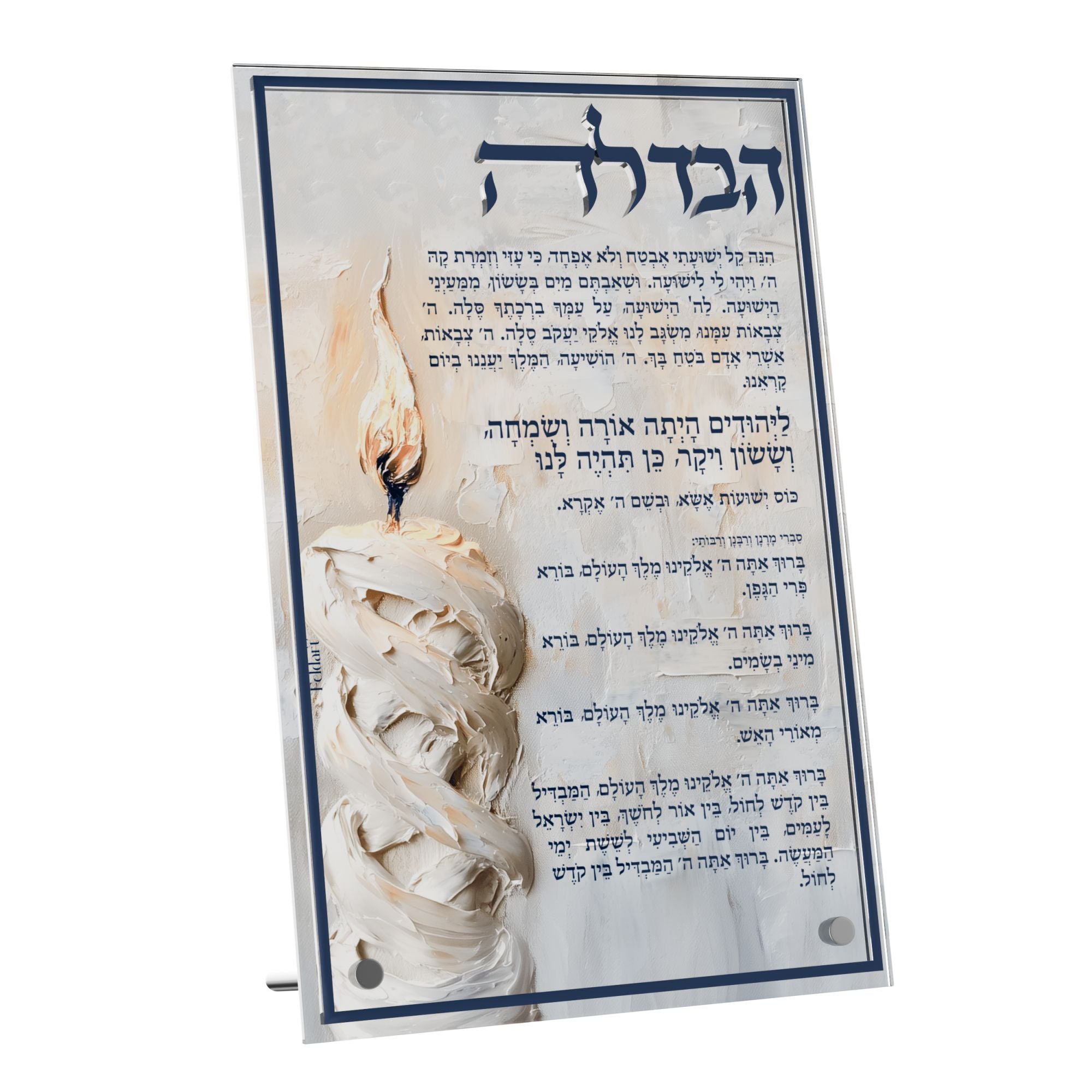 Embrace havdalah in style with the Golden Flame Havdalah Card, a beautifully crafted lucite piece featuring raised 3D titles and borders that radiate elegance. Its clear, easy-to-read text set against a stunning artistic Golden Flame background offers both practicality and sophistication. Elevate your havdalah ceremony with this exquisite card today.