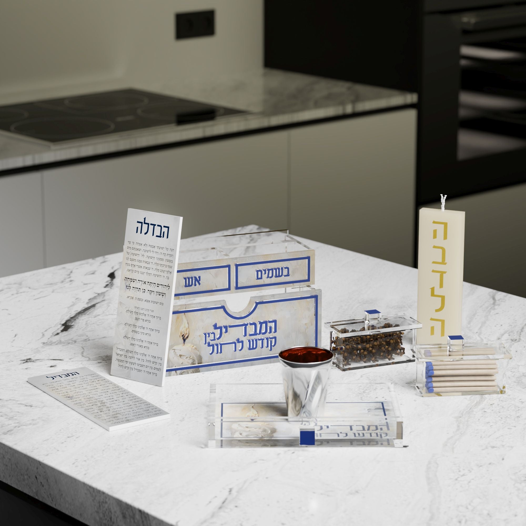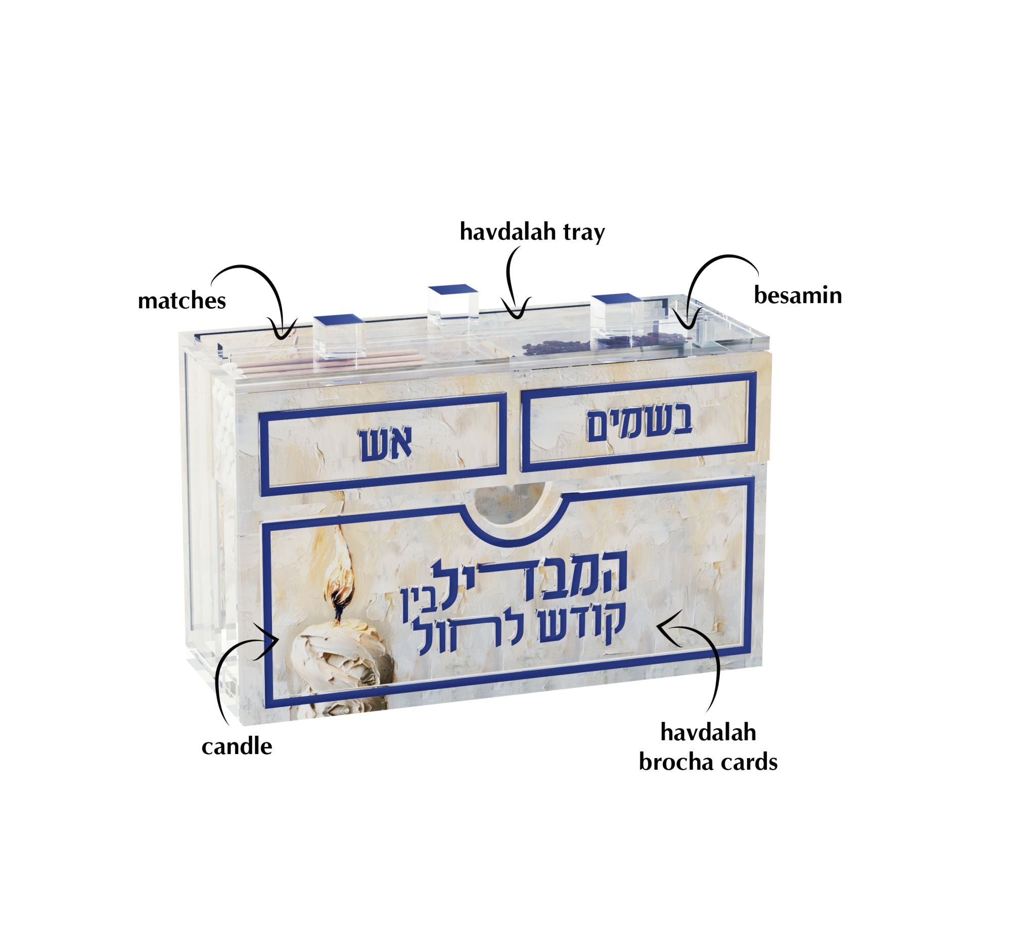 The Compact Golden Flame Havdalah Set offers a refined and practical solution for your Havdalah ceremony. This elegant set includes a Besamim Holder, Match Holder, Candle, Havdalah Brochos Card and Havdalah Tray, all packed into a unique, compact Lucite case adorned with raised metallic 3D borders and lettering. Available in an exquisite Golden Flame design, it combines tradition with a sleek, compact design perfect for any setting.