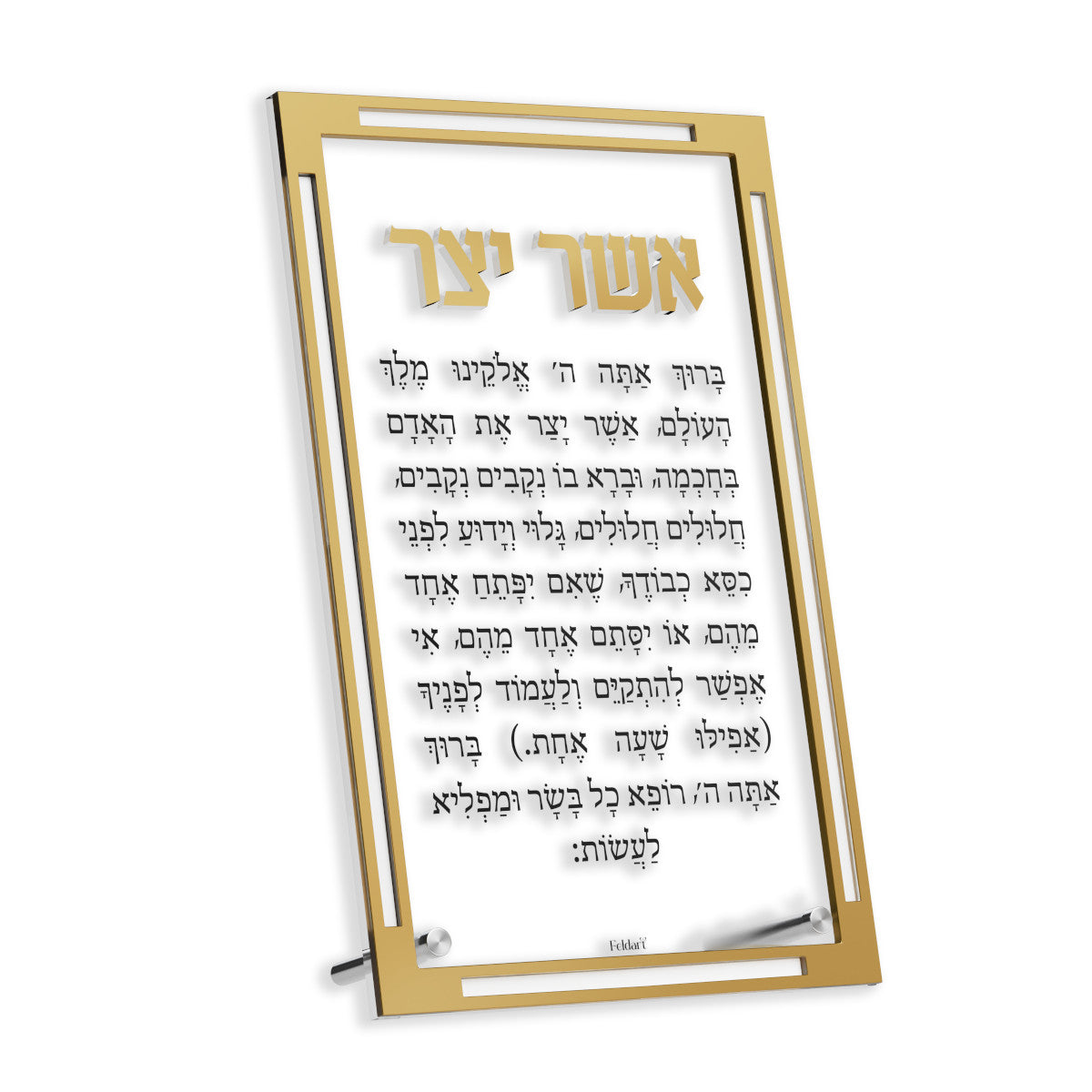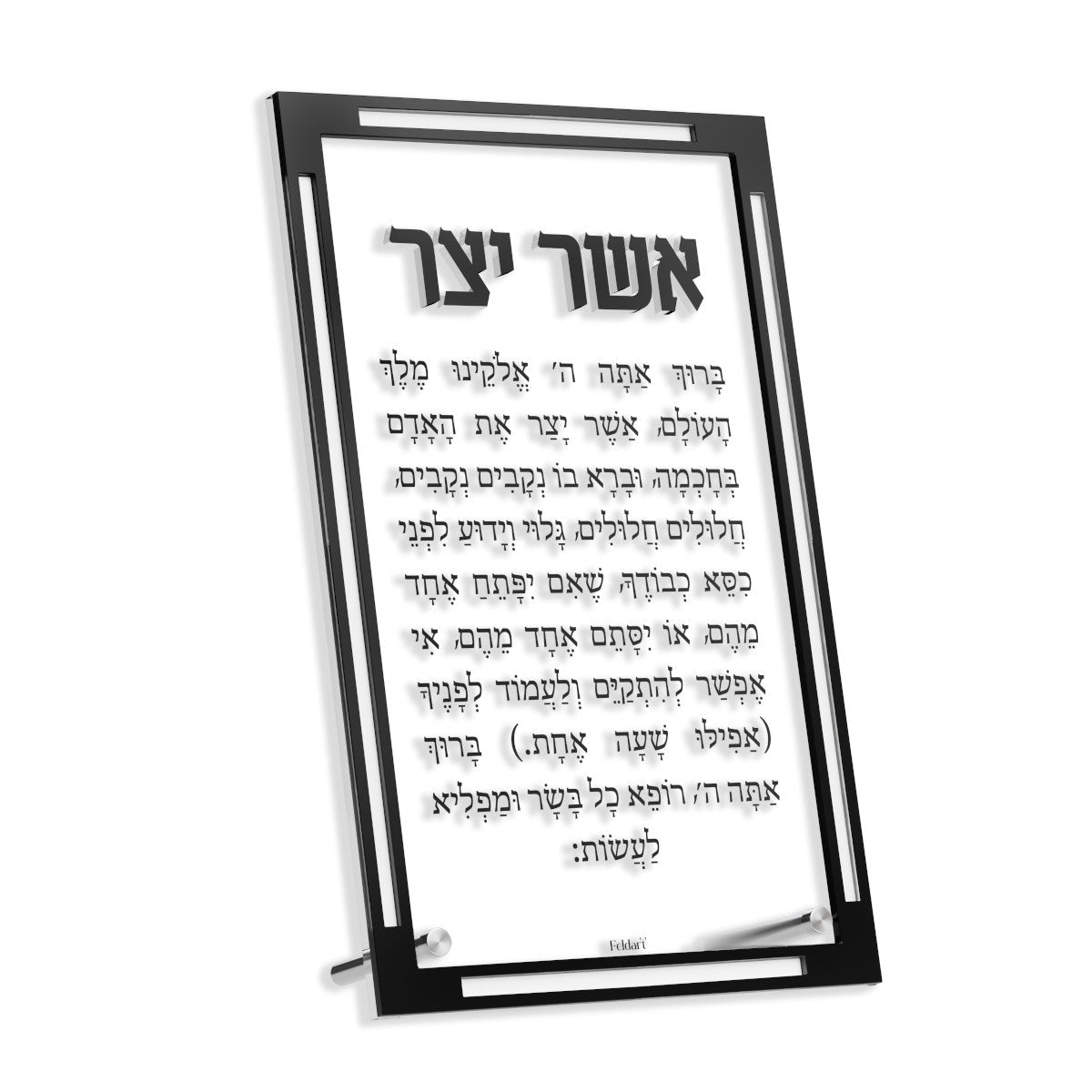 This Classic Asher Yatzar Tabletop Card printed on clear frost acrylic with raised 3D title and borders adds practicality, creating a tasteful yet functional accessory for use in any room.