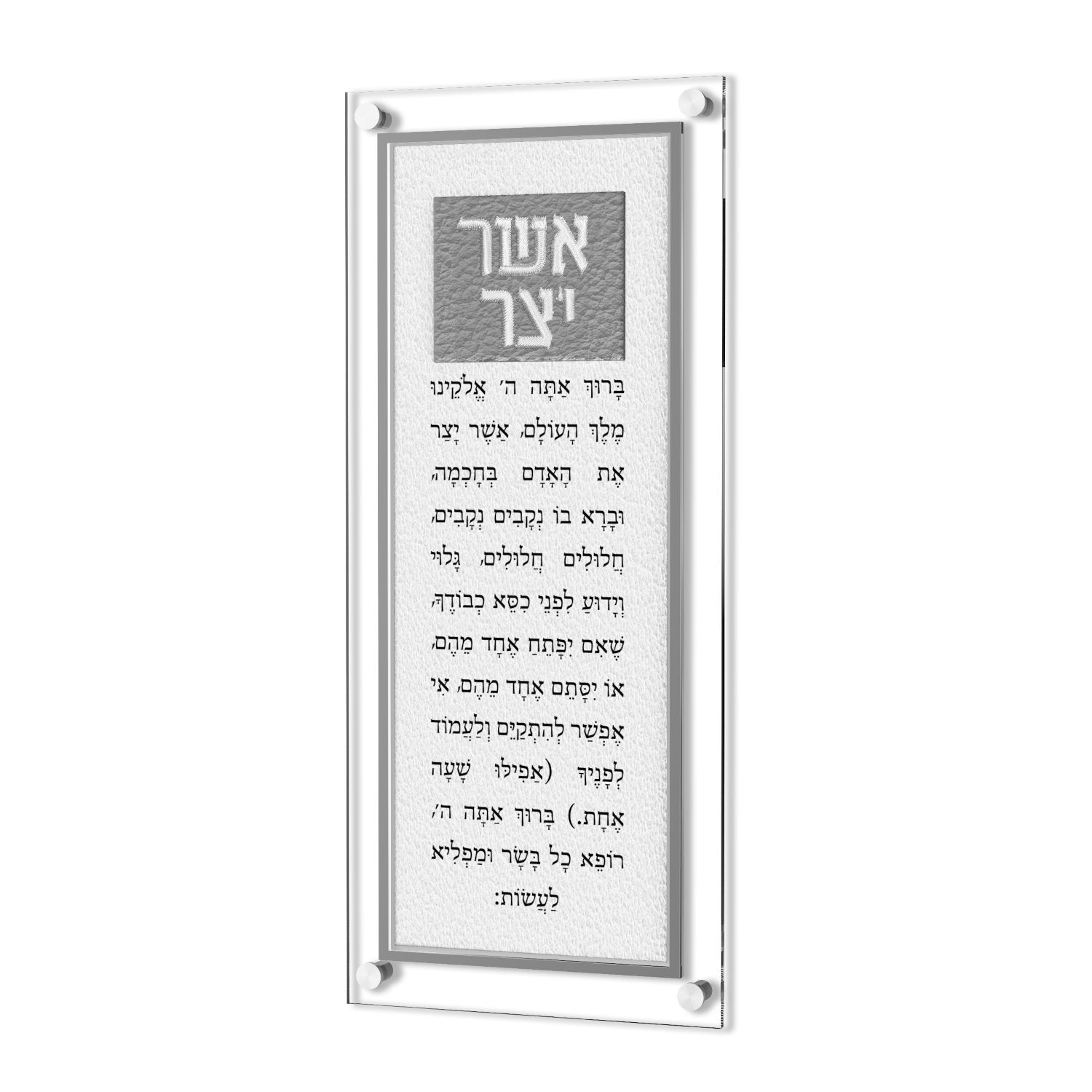 Enrich your home with the luxurious Classic Leatherite Asher Yatzar v.2. Elegantly crafted with leather enclosed between two pieces of Lucite and raised 3D borders. Available in gold or silver, its unique design is intricately printed onto luxurious leather with an embroidered title, creating an exquisite and unparalleled beauty.