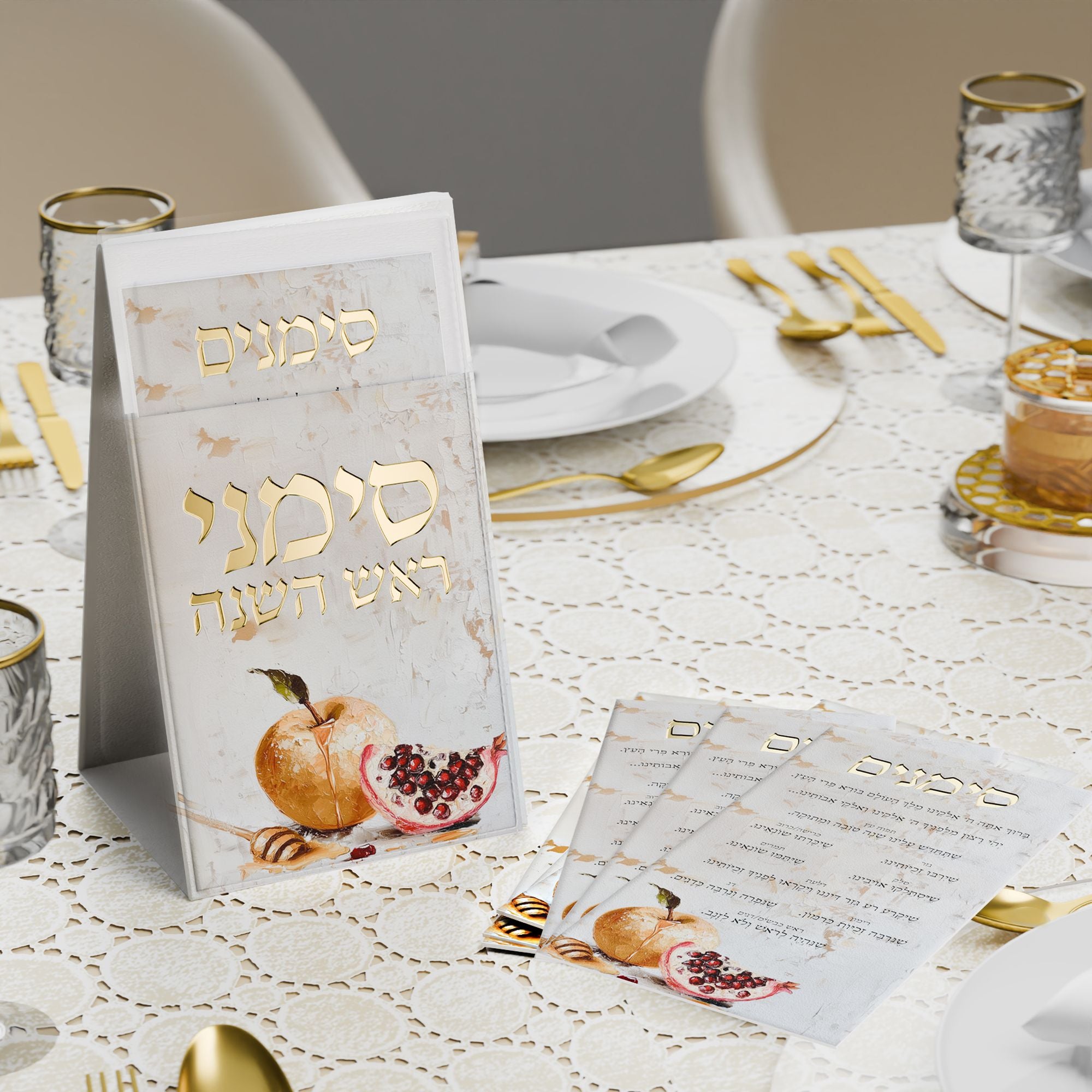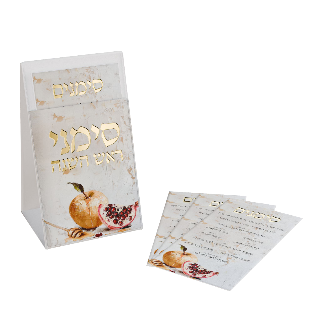 This refined Leather Pouch Apple Pomegranate Simanim Set includes four beautifully crafted leather cards featuring the traditional Simanim Yehi Ratzons, elegantly stored in a leather pouch with a debossed title. The pouch and cards are adorned with stunning apple and pomegranate artwork, symbolizing sweetness and abundance for the new year. A tasteful and meaningful set to enhance your Rosh Hashanah table decor.