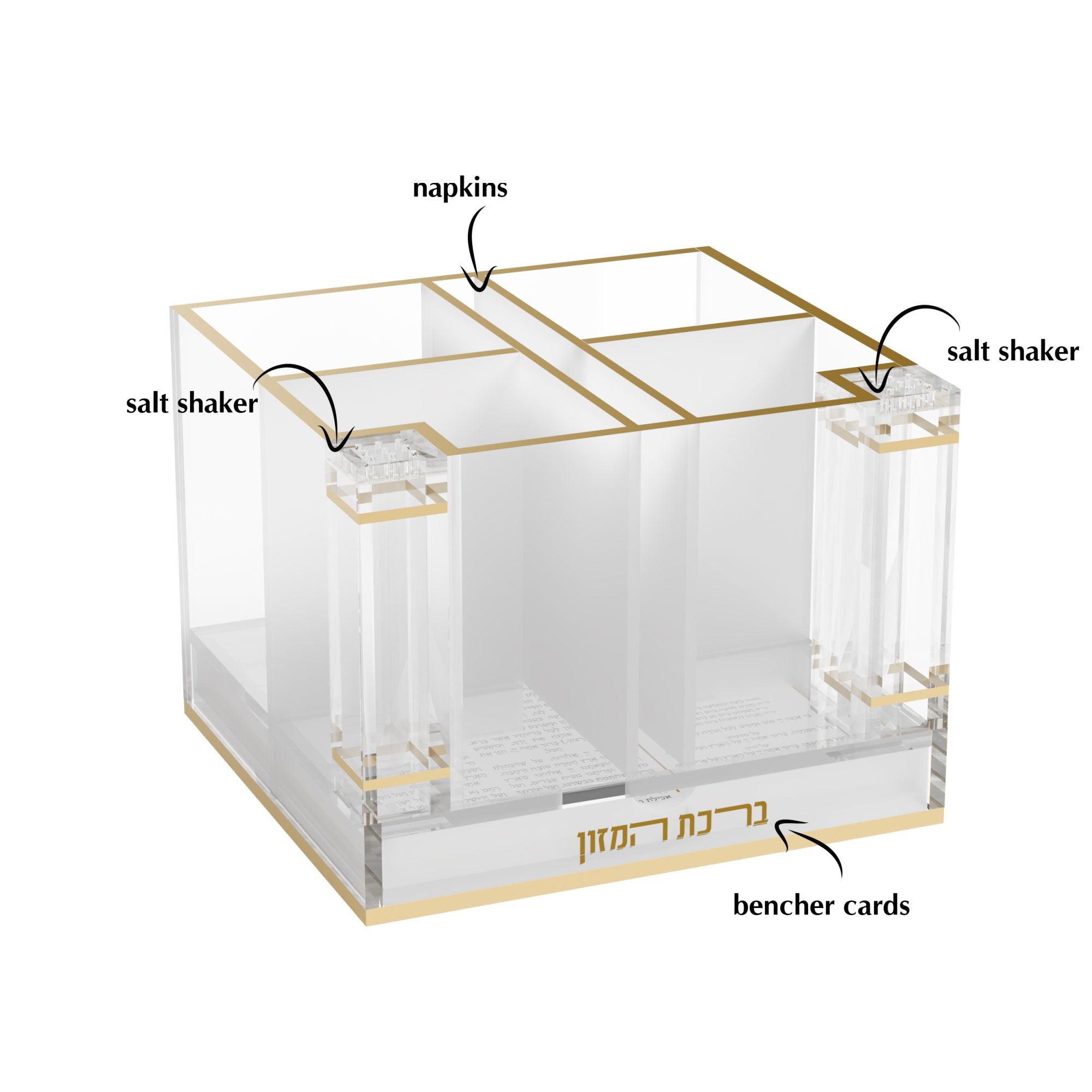 This Classic Cutlery Holder with Salt & Bencher Set combines practicality and elegance in a unique new concept. Available in gold or silver editions, the swivel base allows for easy access to the four compartment cutlery holder, as well as two salt shakers. The compartment underneath safely stores four bencher cards (included), making this set perfect for any sophisticated dining experience.