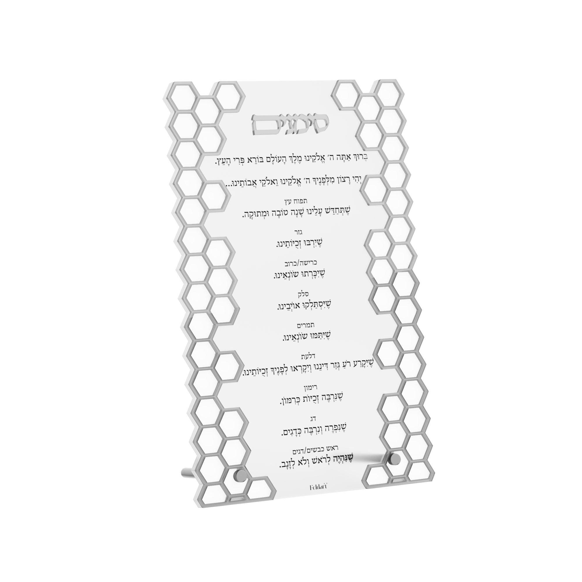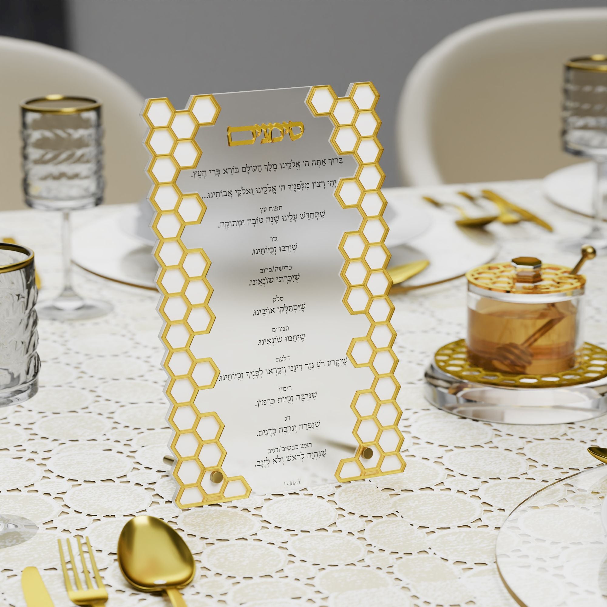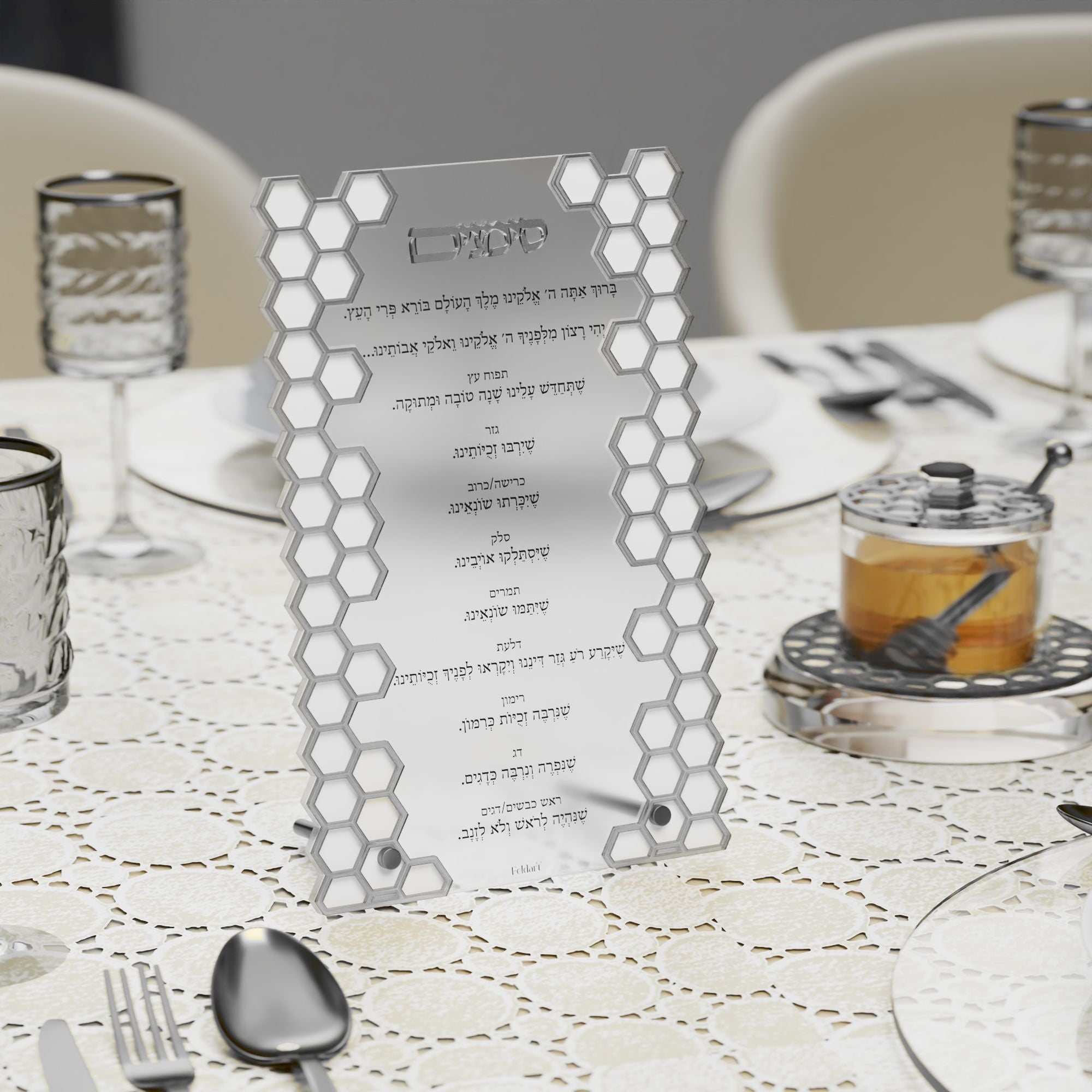 The Laser Cut Honeycomb Simanim Card v.2, crafted from high-quality lucite, features a stunning and sophisticated design perfect for your Rosh Hashanah table. Available in silver or gold, its raised 3D honeycomb pattern and title add depth and elegance, making it a striking and refined addition to your yom tov table decor