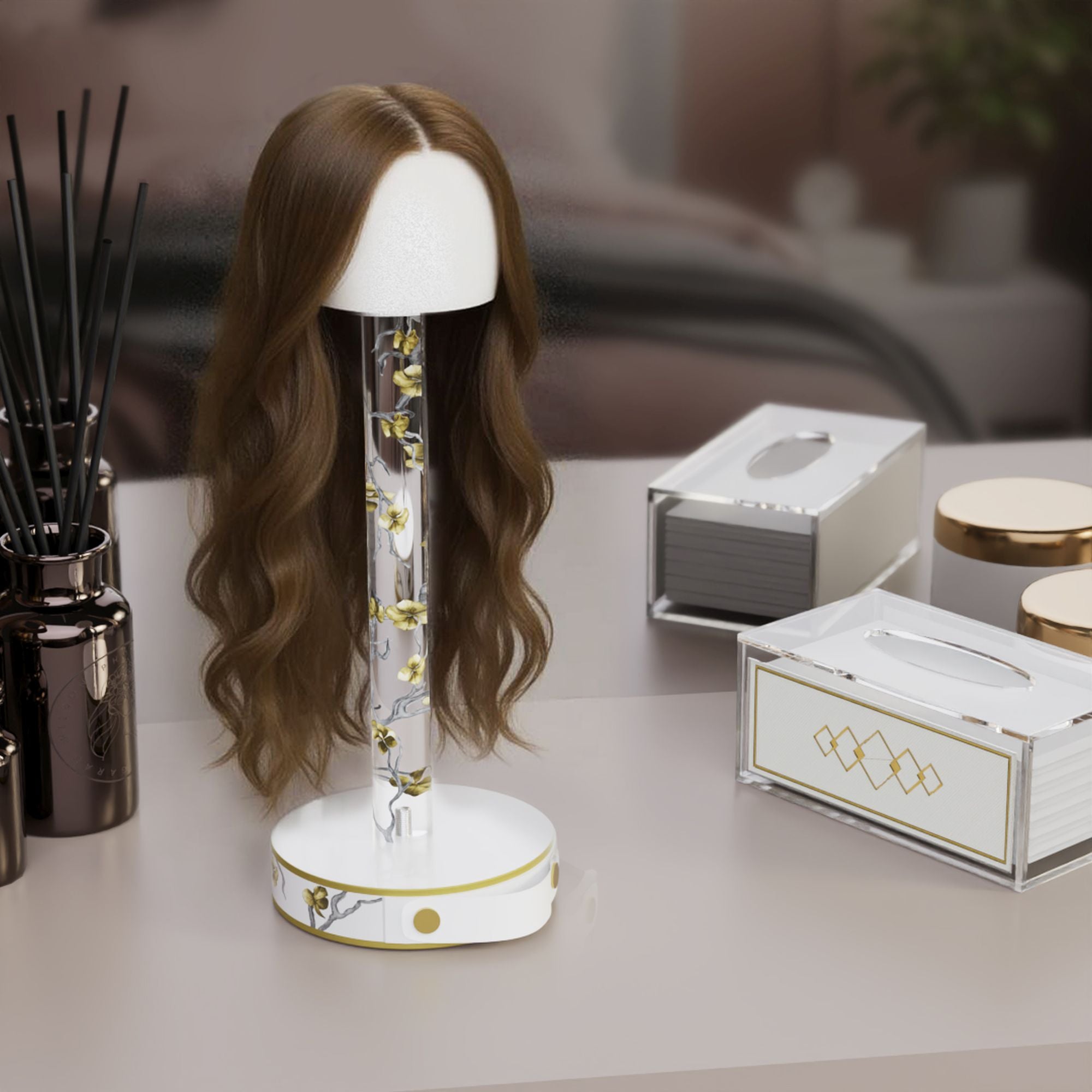Keep your wig safe and stylish with the Golden Branch Wig Head. Say goodbye to dull polystyrene heads and hello to a fashionable, sturdy alternative shaped like a real head in our exclusive Golden Branch design. It protects your wig while adding an elegant touch to your beauty space. With a handy compartment for all your wig accessories, plus two sizes to choose from, it’s the perfect way to keep your wig looking fresh and fabulous.