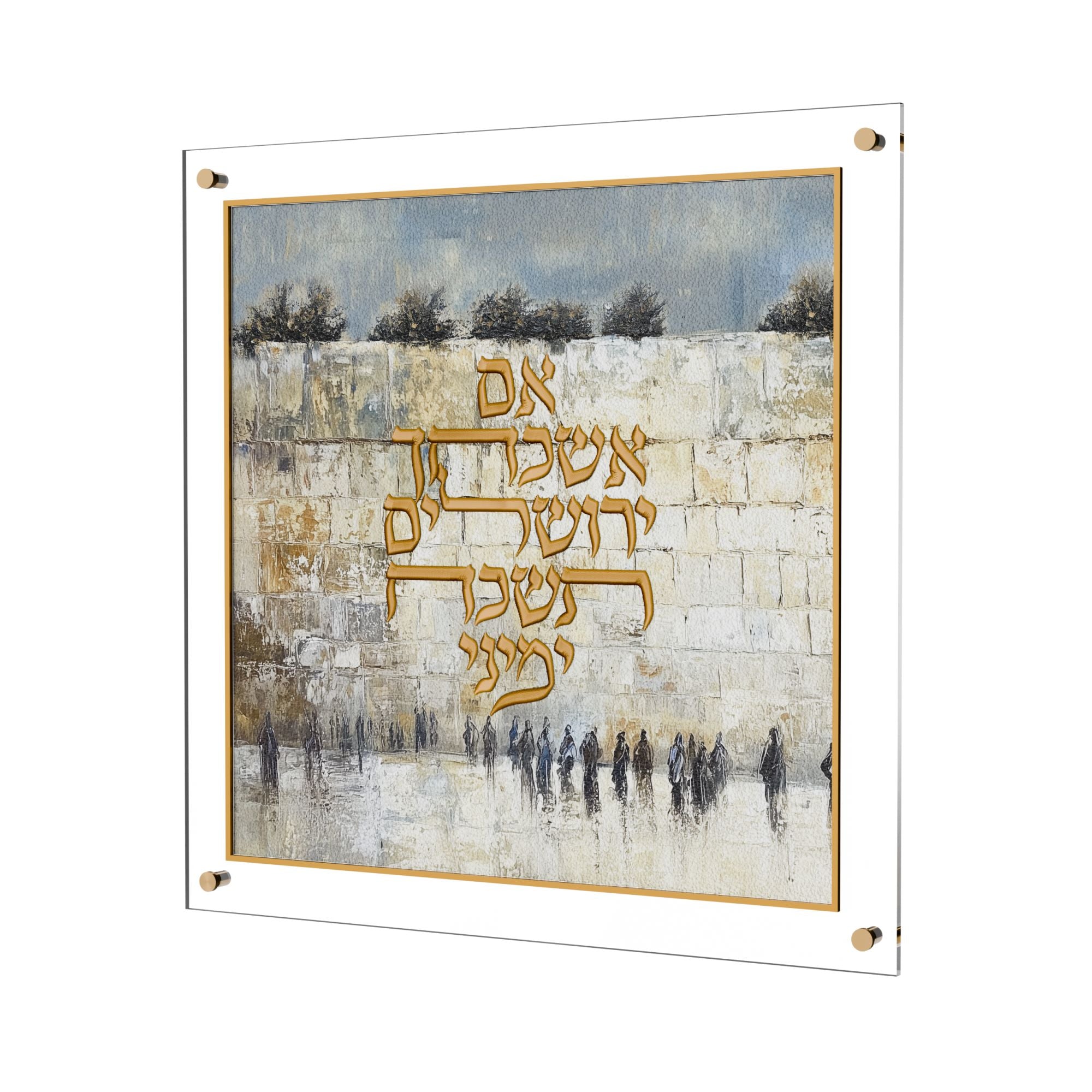Enhance your home with the exquisite and unparalleled beauty of the Leatherite Im Eshkocheich - Beis Hamikdash. This luxurious piece is crafted with a beautiful leather print, intricately embroidered with the text of 'im eshkocheich' and encased between two pieces of Lucite. As a piece of art, it serves as a reminder to never forget Yerushalayim, "If I forget Yerushalayim, let my right hand forget its skill".